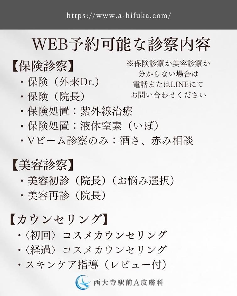 当院では、保険診察、美容診察、一部の美容施術、カウンセリングなど、WEB予約が可能です。