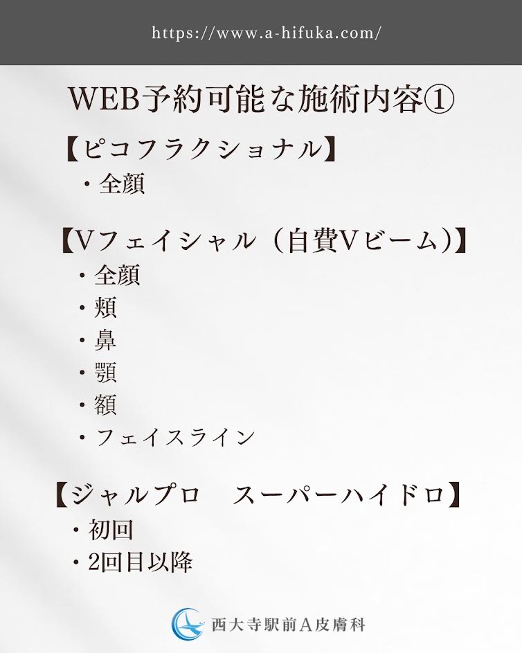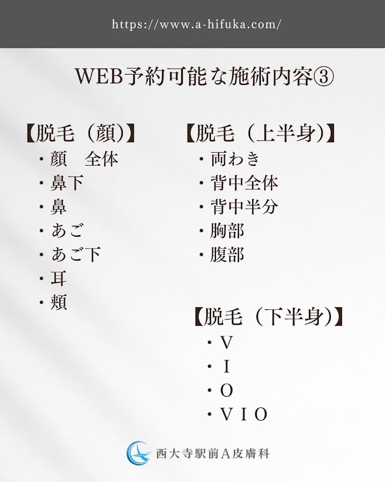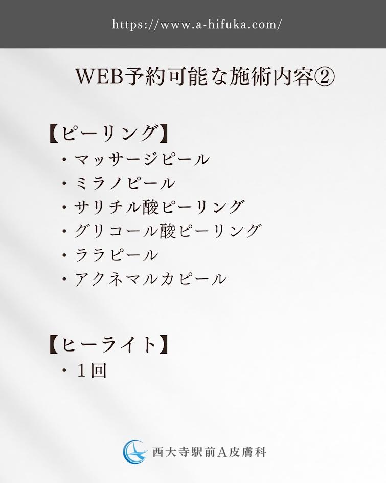 施術に関しては、既に施術を開始されている方や同意書を取得済みの方のみとなり、全ての施術がご予約可能なわけでないので、WEB予約可能な施術は投稿画像をご確認をお願いいたします。