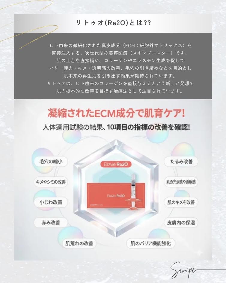 ヒト由来の微細化された真皮成分(ECM:細胞外マトリックス)を直接注入する、次世代型の美容医療(スキンブースター)です。
